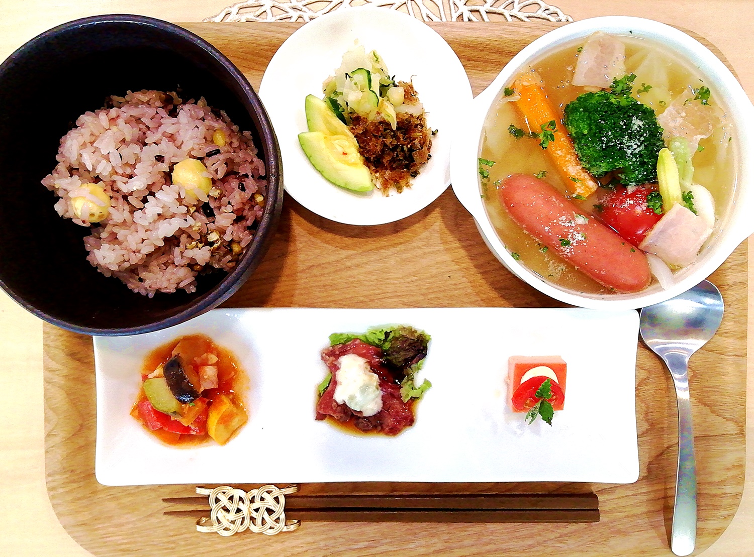 季節に合わせて、夏の暑湿で体にこもった熱と湿を排出し、秋の乾燥から潤いを生み出す食材で、気血水を巡らせるスープの日替わりに、薬膳ご飯、3種の前菜、薬膳茶つき